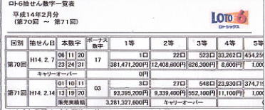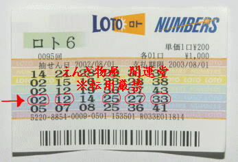 | (2002.09.13着) ロト6その後!! 埼玉県 Mさん(匿名希望) こんにちは。先日、ロト6で2等に1番違いで4等が当たったMと申します。 ロト6で惜しい4等当選の後、大きな当たりは無く、 御社のアドバイス通り、9月の新月の日に再度、願望注入を行いました。 そして、前回と同じ西銀座チャンスセンターでロト6を買ってきました。 (数字選択式宝くじでも購入場所で運気が左右するのでしょうか?) その結果、今度は3等に2番違いで4等が当たりました(^^;) 今回も、あともう一歩のところで大金を逃がしてしまい少し悔しいです。 |