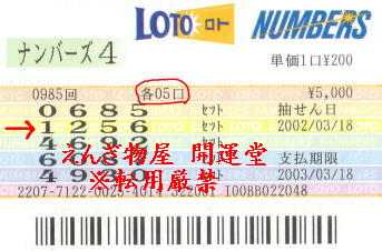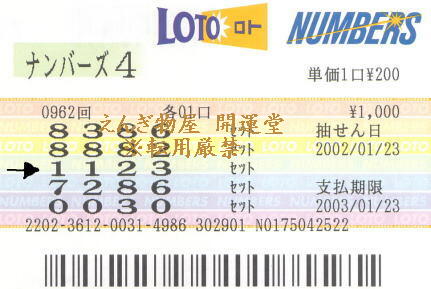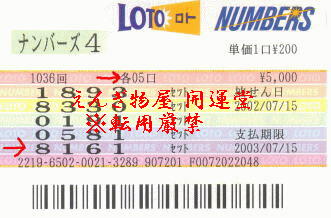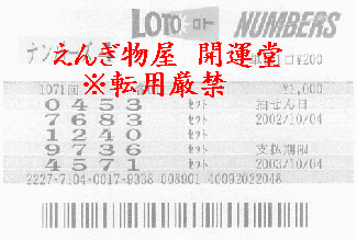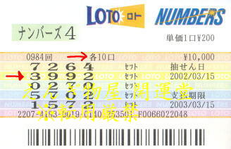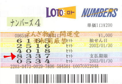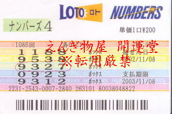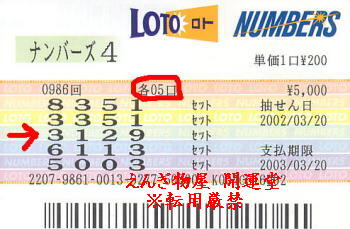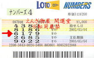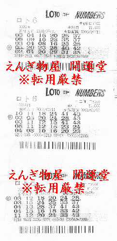 | (2002.03.19着) 開運商品いろいろ買いましたが、ここの護符は本物ですね! 福岡県 Sさん(24才) 1月に金運・勝運護符を購入したSです。 ぼくは今までいろいろな開運商品を買ってきたのですが、 えんぎ物屋 開運堂さんの護符は本物ですね。やはり体験談の多さは嘘じゃないなって感じました 護符買って3週目ぐらいから調子好調です。 財布の中の護符入れる位置自分なりに考えて変えたらそれからです。 昨日ドライブ中に先週のロト6で当てた4等のお金で、ナンバーズで勝負(各5口)買ったら ボックス当選です。 たった10通りでもうひとつ惜しかったのでそのくじもスキャンしてお送りします。 よかったら開運体験談に載せてください。 今後も高額当選目指します。 |