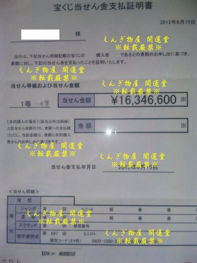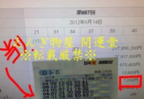 | (2012.06.25着) 不思議ですね。額は小さいですが見事に当選致しました。 沖縄県 匿名希望 さん 女性(40才) えんぎ物屋 開運堂 黒川 様 お世話になっております。××です。 先日は、いろいろとアドバイスありがとうございました。 ご助言いただきましたように、視覚化・注入をさせて頂きました。 不思議ですね。額は小さいですが見事に当選致しました。 6/10 totoBIG 5等当選(1770円)、6/14 loto6 5等当選(1000円)です。 これまで、当選したことが少なかったので素直に驚き、そして嬉しかったです。 きっと護符のお力だと思います。本当にありがとうございます。 画像を添付させて頂きました。 |