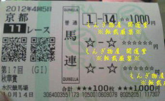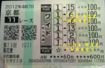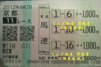 | (2012.11.28着) 蛇剣符を握りしめて、必死にロウソク瞑想しました。ありがとうございます。 岩手県 匿名希望 さん 男性(44才) ※本画像は全てお送り頂いた画像を掲載しています。黒川様、××です。これはオークスの馬券で9-14の払い戻しは8000円です。 ![]() 黒川様、××です。これは秋華賞で1-14で2500円です。 ![]() こちらは菊花賞で1-16でワイドと馬連合わせて10000円です。 ![]() 黒川様、××です。菊花賞ワイドです。 ![]() 黒川様、××です。こちらはエリザベス女王杯で550円です。 ![]() 黒川様、××です。こちらは 今日の馬券、ジャパンカップで15-17で7000円です。 蛇剣符を握りしめて、必死にロウソク瞑想しました。ありがとうございます。 |