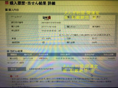 | (2017.11.11着) こちらの体験談の方々の足元にも及ばないので恥ずかしいですが… 福岡県 匿名希望さん 女性 29才 開運堂様 先日初めて貴店で護符を購入した××と申します。 購入した護符は、天帝十二支守護霊符、一攫千金必勝実現乃金箔符の二点です。 敏速丁寧な対応をありがとうございました。 私は大きな夢があって以前よりネットバンクでロト6を購入しているのですが早速結果がでましたので開運体験のメールを差し上げました。 購入は毎回2口のみでキャリーオーバーの時だけ3口です。 購入数も少ないためほとんど当たった事はありません(>_<) それが先日のロト6で4等初当選しました。 本当に本当に貴店の護符はすごいです。 こちらの体験談の方々の足元にも及ばないので恥ずかしいですが わたしにとっては奇跡のような出来事で驚いています!(^^)! よろしければ励みになりますの開運体験談に掲載してください。 画像も添付していますので御査収ください。 今後も何かありましたら報告します。 |