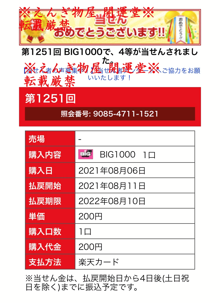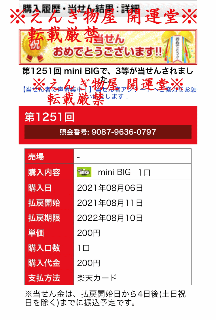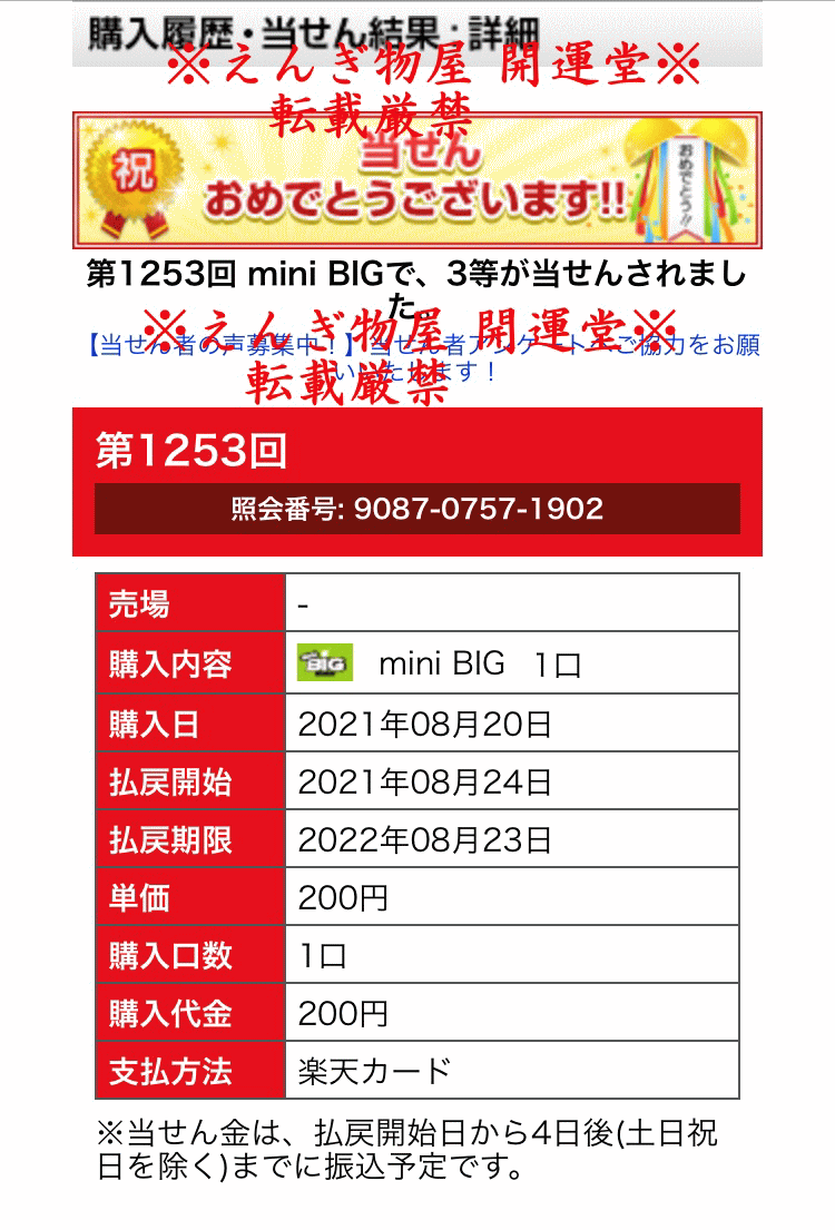 (2012.09.29着)★今年に入りミニロトで1等当選できました。