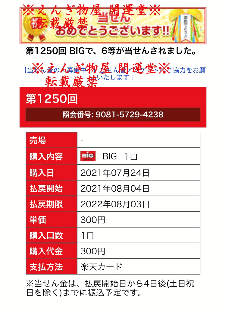 (2007.10.01着)★ロト6一等当選の御礼です。(第350回1億1720万4300円)